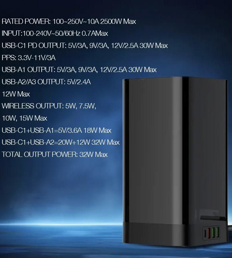 دارای 1 عدد پورت تایپ سی با پشتیبانی از فناوری PD و حداکثر توان خروجی 30 وات، مجهز به 4 پریز ارت دار