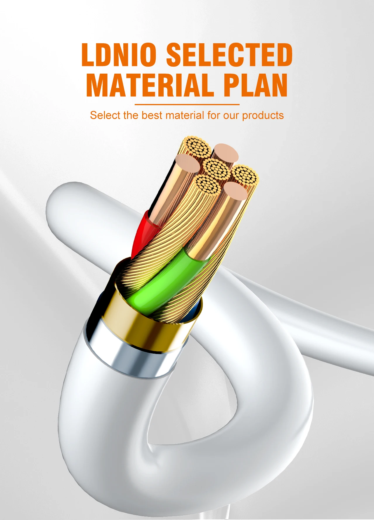 کابل USB-C الدینیو مدل LC601C به گونهای طراحی شده است که در برابر استفاده مکرر و شرایط سخت دوام بالایی داشته باشد. روکش آن از جنس TPE (نوعی پلاستیک با قابلیت ارتجاعی بالا) و هسته داخلی آن از الیاف 250D ساخته شده است. این ترکیب، مقاومت کابل را در برابر سایش، پارگی و خمیدگی افزایش میدهد. طبق گفته سازنده، این کابل میتواند بیش از 10000 بار خم شدن نود درجه را بدون هیچ آسیبی تحمل کند. همچنین از کابل الیافی پیشرفته به قطر ۶ میلی متر محافظت می کنند که نشان دهند این است که کابل می تواند به مدت طولانی حتی در شرایط سخت فعالیت کند.