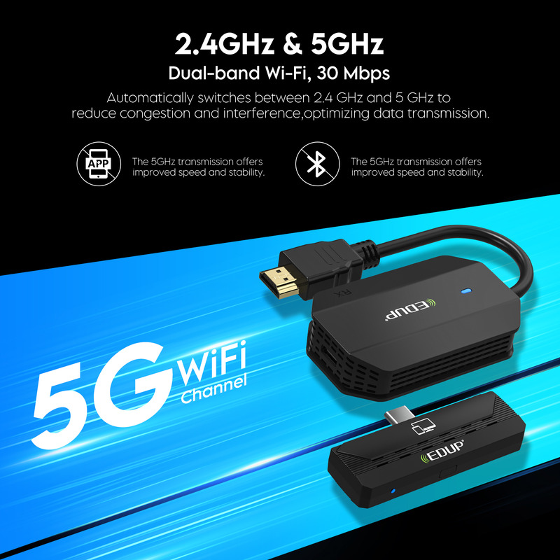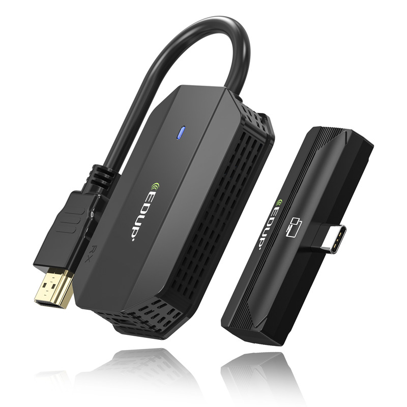 دانگل انتقال تصویر Type-C بی سیم برند EDUP مدل EH-WD9905C با استفاده از فرستنده و گیرنده خود تصویر شما را با رزولوشن 1080p یا به اصطلاح FullHD تا شعاع ۵۰ متری بدون مانع(دقت داشته باشید ممکن است در فضای بسته تا ۱۰ متر کاهش یابد) به صورت وایرلس بدون هیچگونه لگی در نمایشگر دلخواه شما به نمایش میگذارد. تاخیر ۰.۱ ثانیه ای این امکان را به شما میدهد که از انتقال تصویر روان بهره ببرید.استفاده از این محصول به صورت Plug & Play بوده و نیاز به نصب هیچگونه برنامه یا درایور خاصی ندارید و کافی است TX,RX یا با یکدیگر Pair کنید.از این دانگل برای انتقال تصویر انواع گوشی و تبلت های آیفون و اندروید که دارای قابلیت Screen mirror میباشند(اندروید های اقتصادی همانند سری A سامسونگ این قابلیت را ندارند)میتوانید بهره ببرید.