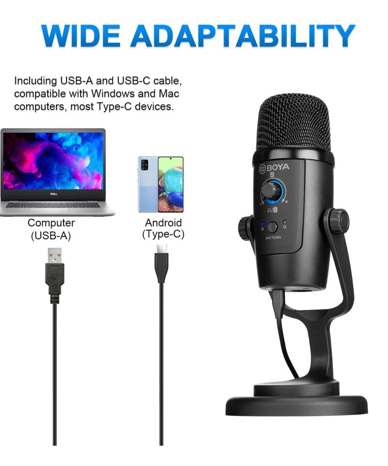 میکروفون بویا مدل BY-PM500 یک میکروفون کاندنسر حرفهای با دو الگوی قطبی کاردیوئید و Omni-directional است که امکان ضبط صدا را بهصورت متمرکز یا ۳۶۰ درجه فراهم میکند. این میکروفون با اتصال USB و USB-C به کامپیوتر، لپتاپ، تبلت و گوشیهای هوشمند متصل شده و بهصورت Plug & Play کار میکند. پاسخ فرکانسی گسترده و نرخ نمونهبرداری بالا، صدای شفاف و بدون نویزی را ارائه میدهد. دارای کنترل ولوم و دکمه Mute برای مدیریت راحتتر ضبط صدا است. طراحی زیبا، کیفیت ساخت بالا و کاربری آسان، آن را برای پادکست، ویدئو کنفرانس و استودیوهای خانگی ایدهآل کرده است. این میکروفون انتخابی عالی برای کاربران حرفهای و نیمهحرفهای محسوب میشود.